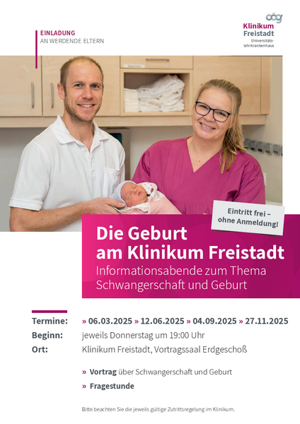 Rund 500 Geburten finden Jahr für Jahr im Klinikum Freistadt statt. Damit werdende Mütter und Väter den Ablauf und die Möglichkeiten schon vor dem Ereignis kennenlernen, veranstalten wir Infoabende inklusive einer Besichtigung der Kreißzimmer. Auch das untenstehende Video zeigt Ihnen Wissenswertes über die Geburt am Klinikum Freistadt.
