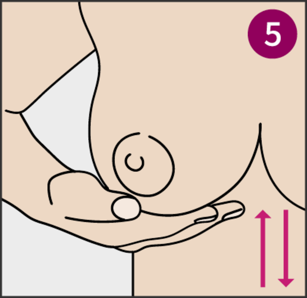 Den Oberkörper vorbeugen und die Brust schütteln, sodass der Milchfluss nach vorne unterstützt wird.