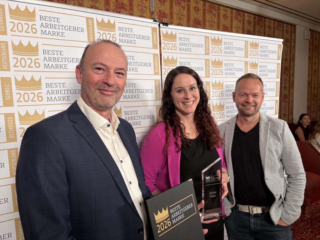 Die Oberösterreichische Gesundheitsholding (OÖG) wurde mit der Auszeichnung „Beste Arbeitgebermarke 2026“ in Silber in der Kategorie „Recruiting“ geehrt. V.l.n.r.: Mag. Herbert Heidlmair, MBA (interim. Leiter Personaldirektion OÖG), Ricarda Vierlinger, MSc, MBA (Personalmarketing OÖG), Manfred Pamminger, BSc MSc MA (Lehrlingskoordinator OÖG)