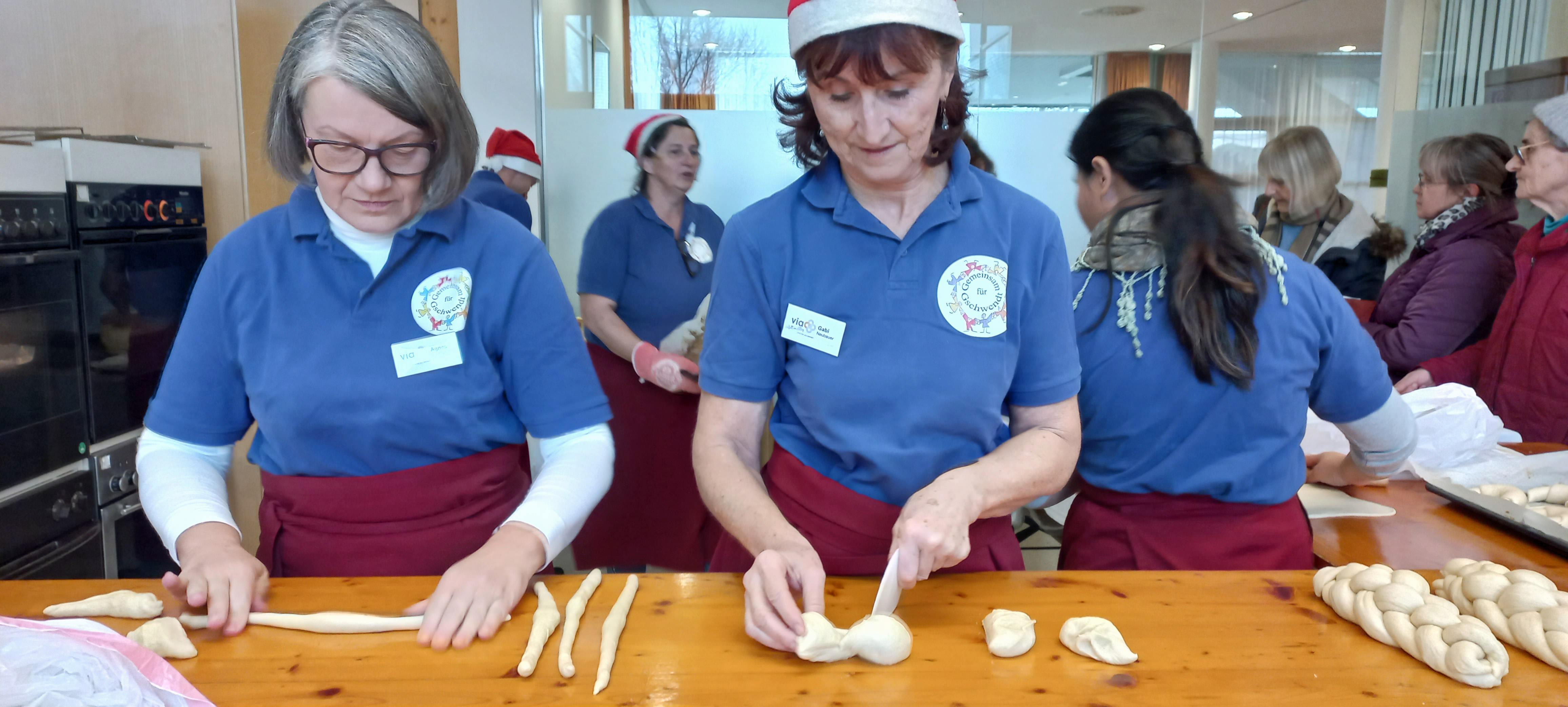 Bildtext 3: Nicht einmal das größte Getümmel kann die bereits pensionierten Pflegemitarbeiterinnen aus dem LPBZ Schloss Gschwendt, Agnes Blaimschein (li.) und Gabriele Neubauer, in ihrer „Schaubackstube“ am Kathreinmarkt aus der Ruhe bringen.